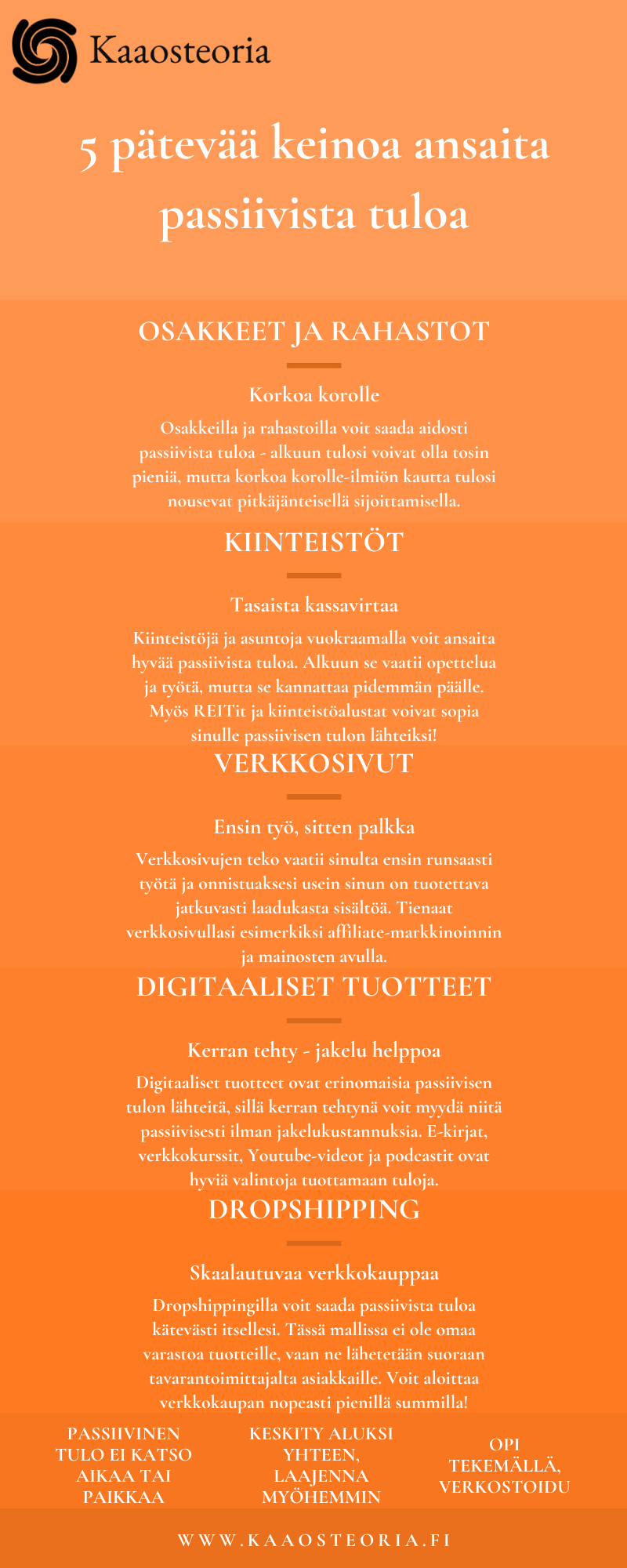 Passiivinen tulo tarkoittaa käytännössä sitä, että alkuun usein tehdään työtä ja tämän työn kypsiä hedelmiä poimitaan sitten vuosien ajan passiivisesti ilman suurempaa vaivannäköä. Tässä artikkelissa pääset tutustumaan tärkeimpiin ja tuottavimpiin keinoihin ansaita passiivista tuloa osakkeista digitaalisiin tuotteisiin.
